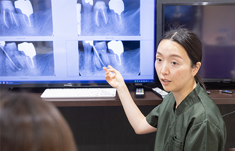 野田先生は10年以上、大型医療法人でマイクロスコープによる根管治療をメインに行ってきました。治療の精密性はさることながら、野田先生が重視するものの一つに「説明と信頼」があります。「なぜこの治療が必要なのか」を言葉だけで説明するのではなく、実際の映像を見せることで、患者さんは自身の現状を視覚的な理解として受け止め、納得して治療を受けることができるでしょう。針の穴を通すような治療の詳細を、しっかりと理解することができるのは強みであるといえますね。